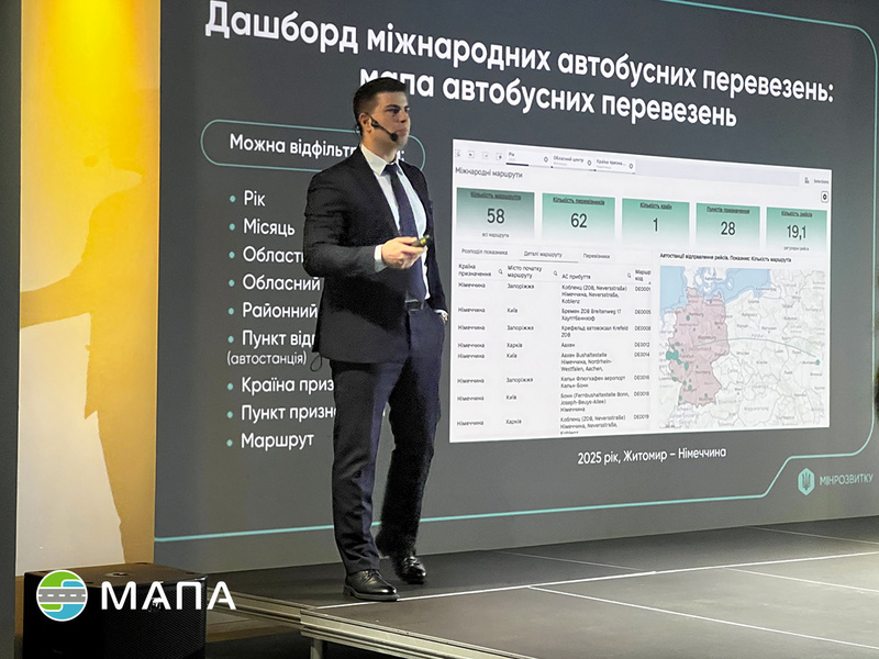 На дашборді є інформація про міжнародні автобусні маршрути, ключові показники маршрутів і виконаних перевезень, і інструменти для дослідження та аналізу даних за різноманітними напрямами. Є МАПА автобусних перевезень, МАПА сполучень від автостанції до місця призначення.